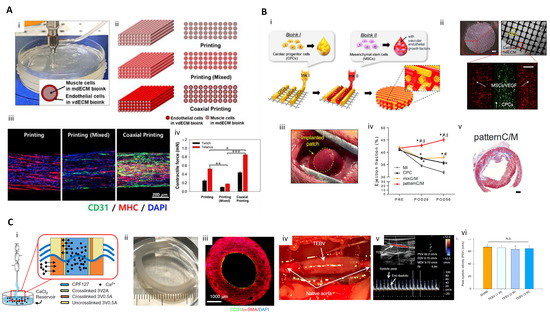 Both skeletal muscle and myocardium have sarcomeres and exhibit strong contractile properties through highly organized bundle structures. Skeletal muscle contains bundle structures arranged in parallel, and regenerating the contractile bundle structure of these skeletal muscles is important for the treatment of skeletal muscle loss. Kang et al. used a mixture of gelatin, fibrinogen, and hyaluronic acid as a bioink to encapsulate C2C12 myoblasts to print muscle structures. For cell arrangement, a uni-axial constraint was generated through tissue shrinkage caused by cell-mediated ECM remodeling. After the structure was cultured for seven days after printing, it was confirmed that the muscle cells were aligned in one direction in the 3D muscle structure. This mature muscle structure was transplanted ectopically and subcutaneously into nude rats and embedded with the common fibular nerve (CPN) for integration with the nerve. After two weeks, the nerve and muscle fibers were in contact, and the muscle function was improved [26]. Choi et al. printed a pre-vascularized muscle structure imitating the hierarchical architecture of vascularized muscle using the coaxial nozzle printing technique. Muscle cells encapsulated in skeletal muscle dECM bioink was ejected through the core nozzle. Vascular endothelial cells were encapsulated in vascular dECM bioink and extruded through the shell nozzle. When the 3D-printed muscle structures were implanted in a rat model of volumetric muscle loss, vascularization, innervation, and muscle contraction recovery were improved in the coaxial nozzle printing group compared to other groups. This study showed that an implant structure with spatially controlled, tissue-specific bioink and cells provides organized microenvironmental cues to differentiate each cell type, leading to more effective muscle regeneration (Figure 3A) [100].