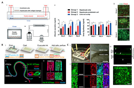 3D printed liver-on-a-chip and kidney-on-a-chip. (A) 3D printing-based liver-on-a-chip (i) Schematic diagram of one-step fabricated liver-on-a-chip with a vascular channel; (ii) Liver function analysis with albumin and urea tests (* p < 0.05); (iii) hepatocyte viability on Day 6 (scale bar: 100 μm) (reproduced with permission from ref [94]; published by The Royal Society of Chemistry). (B) 3D vascularized proximal tubule on a chip (3D VaPT) model; (i) Fabrication process of the 3D VaPT model; (ii) The fluorescence image of the 3D VaPT model. PTECs are presented in blue, GMECs in red, and nuclei in blue (Scale bar: 1 mm). The cross-sectional views of each microchannel (scale bar: 100 μm); (iii) Magnification of PTECs and GMECs channel in the 3D VaPT model (scale bar: 100 μm). (C) 3D cell-printed renal proximal tubule-on-a-chip with tubular RTPEC and HUVEC constructs. (i) Microfluidic system and dual tubular constructs of the chip after fabrication; (ii) Fluorescence image of renal proximal tubular markers (AQP1, aquaporin 1), and vascular markers (vascular endothelial (VE)-cadherin, and CD31) in the chip after maturation. The renal proximal tubular marker is presented in green, vascular endothelial markers are red, and nuclei are blue (scale bar: 100 μm); (iii) Albumin reabsorption between RTPEC and HUVEC tube via vectorial transport. Arrows indicate the intracellular accumulating albumin within the RPTEC and sidewall of the vessel (scale bar: 400 μm) (reproduced with permission from ref [123]; copyright 2020 Elsevier).