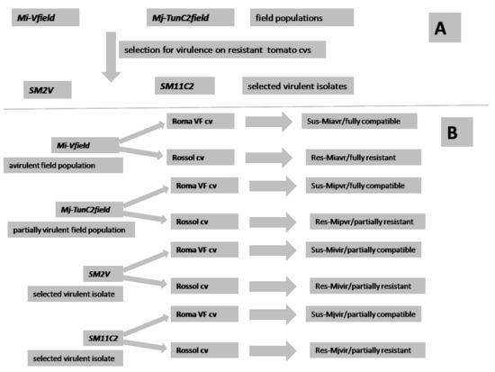 (A) Scheme of the selection for virulence to which the field populations Mi-Vfield and Mj-TunC2field were subjected to obtain the virulent isolated SM2V and SM11C2; (B) scheme of the nematode-plant interactions realized in this study.