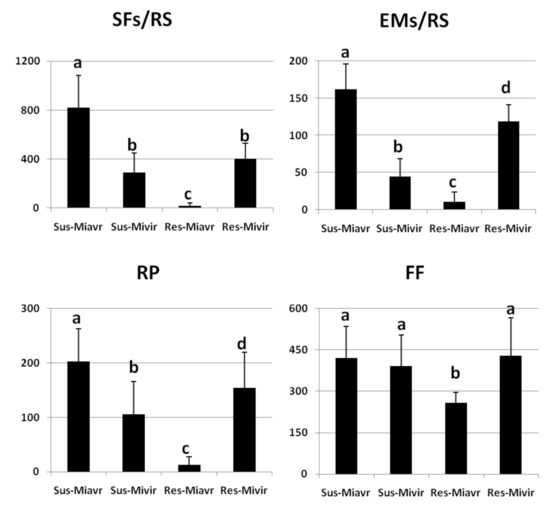 The avirulent field population Mi-Vfield showed a high RP and high numbers of SFs/RS on susceptible tomato (approx. 200 and 800, respectively) but very low ones (approx. 13 and 17) on resistant tomato, as expected (Figure 2). The ability to develop and reproduce on resistant tomato drastically increased in the virulent isolate SM2V. The partial virulent wild-type population Mj-TunC2field was very aggressive on susceptible tomato with more than 1200 SFs/RS (Figure 3). Increased competition for food lessened both FF and RP of Mj-TunC2field, with respect to those of Mi-Vfield. Of course, Mj-TunC2field was much less aggressive on resistant tomato, showing a relatively low RP value. The virulent isolate SM11C2developed on resistant tomato at a level similar to its starting field population Mj-TunC2field; conversely, because of its higher FF value, its overall reproductive rate resulted higher. The selective pressure operated on both isolates and the resulting genetic homogeneity may have been the cause of the observed diminished aggressiveness and reproduction rate on susceptible plants, with respect to the starting field populations (Figure 2 and Figure 3). Mi-1.2-conferred resistance was broken by those virulent isolates, although they could not achieve the reproduction rates observed in full compatibility. Actually, full compatibility was realized only in the interactions between field populations and susceptible tomato, whilst there was full incompatibility in the interaction between Mi-Vfield and Rossol (Figure 1B).