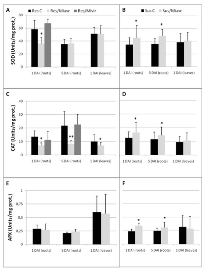 Anti-oxidant enzyme activities of resistant (Res C) and susceptible (Sus C) un-inoculated control plants compared with those of plants inoculated with the avirulent field population Mi-Vfield (Res/-Sus/Miavr) and with the virulent isolate SM2V (Res/Mivir). Superoxide dismutase (SOD—A,B), catalase (CAT—C,D), and ascorbate peroxidase (APX—E,F) activities are expressed as Units mg-1 prot. Protein extraction was carried out using roots 1 and 5 DAI and using leaves 1 DAI. Values are shown as means (n = 9) ± SD. Means coming from tissues of inoculated plants were separated from those of un-inoculated controls by a t-test; asterisks indicate significant difference (*p < 0.05; **p < 0.01).