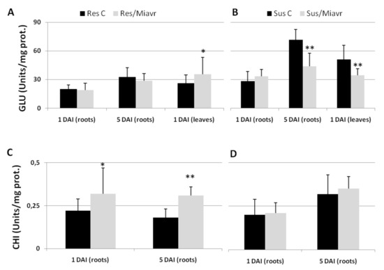 Defense enzyme activities of resistant (Res C) and susceptible (Sus C) un-inoculated control plants and of plants inoculated with the avirulent field population Mi-Vfield (Res/-Sus/Miavr) or with the virulent isolate SM2V (Res/Mivir). Glucanase (GLU—A,B), and chitinase (CHI—C,D) activities are expressed as Units mg-1 prot. Protein extraction was carried out using roots 1 and 5 DAI and using leaves 1 DAI, as it concerned GLU; CHI was assayed only in roots 1 and 5 DAI. Values are shown as means (n = 9) ± SD. Means coming from the inoculated roots were separated from those of un-inoculated control roots by a t-test; asterisks indicate significant difference (*p < 0.05; **p < 0.01).