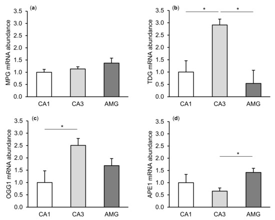 Both the hippocampus and amygdala are components of the limbic system. They process large amounts of information from various brain regions and are vital for learning and memory, as well as emotional behavior [23,24]. Moreover, the hippocampus is distinguished by numerous biochemical changes that ultimately determine neuronal connections and functions. It is also well known that the dentate gyrus–CA3 system exhibits structural plasticity with regenerative and remodeling capacity [26]. The chain of molecular events occurring within these structures has a high oxygen demand, leading to the exposure of neurons to the associated ROS byproducts [13]. It has been reported that the hippocampus and amygdala are among the brain structures that are most susceptible to oxidative stress and may succumb more easily to cell or DNA-damaging processes [27]. The results showed potential DNA protective and repair events concerning enzyme activities of the BER pathway, which take place in the sheep hippocampus and amygdala under normal conditions. It is worth noting the 2.5–3.0-fold lower abundances of TDG and OGG1 transcripts in the hippocampal CA1 field than in the CA3 field, which is in agreement with the observation that hippocampal CA1 neurons are much more vulnerable than CA3 neurons to a variety of adverse conditions [28,29]; thus, they may provide greater post-transcriptional activities.