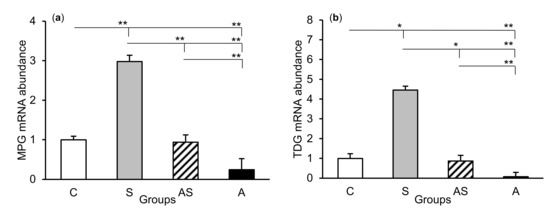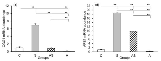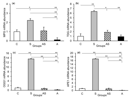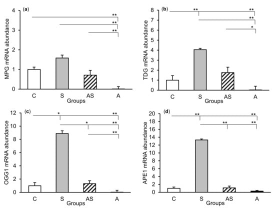 Relative mRNA abundance (mean ± SEM) of N-methylpurine-DNA glycosylase (MPG), (a) thymine-DNA glycosylase (TDG), (b) 8-oxoguanine glycosylase (OGG1), (c) and AP-endonuclease 1 (APE1), (d) in the central amygdaloid nucleus of sheep treated with: vehicle (C), vehicle and stressful stimuli (S), allopregnanolone and stressful stimuli (AS), and allopregnanolone alone (A). Significance of differences: * p < 0.05, ** p < 0.01.