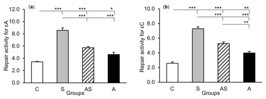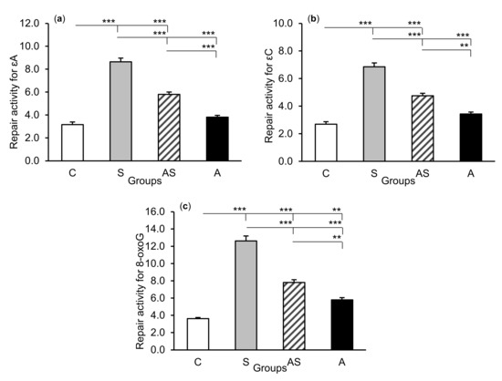 Repair activities (fmol/µg protein/h) for 1,N6-ethenoadenine (εA), (a) 3,N4-ethenocytosine (εC), (b) and 8-oxoguanine (8-oxoG), (c) in the central amygdaloid nucleus of sheep treated with: vehicle (C), vehicle and stressful stimuli (S), allopregnanolone and stressful stimuli (AS), and allopregnanolone alone (A). Significance of differences: * p < 0.05, ** p < 0.01, *** p < 0.001.