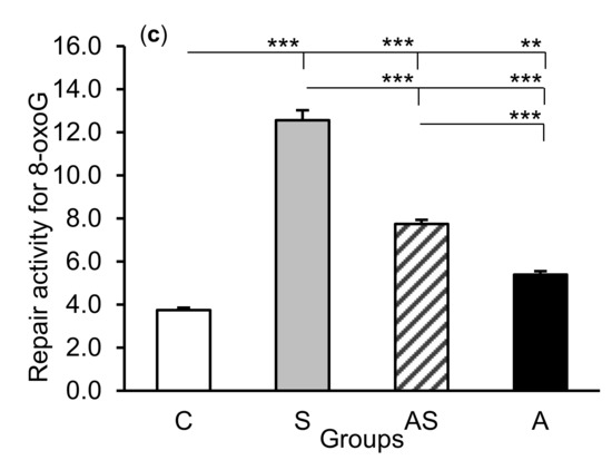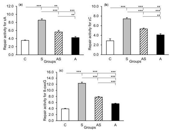 Repair activities (fmol/µg protein/h) for 1,N6-ethenoadenine (εA), (a) 3,N4-ethenocytosine (εC), (b) and 8-oxoguanine (8-oxoG), (c) in the hippocampal CA3 field of sheep treated with: vehicle (C), vehicle and stressful stimuli (S), allopregnanolone and stressful stimuli (AS), and allopregnanolone alone (A). Significance of differences: ** p < 0.01, *** p < 0.001.