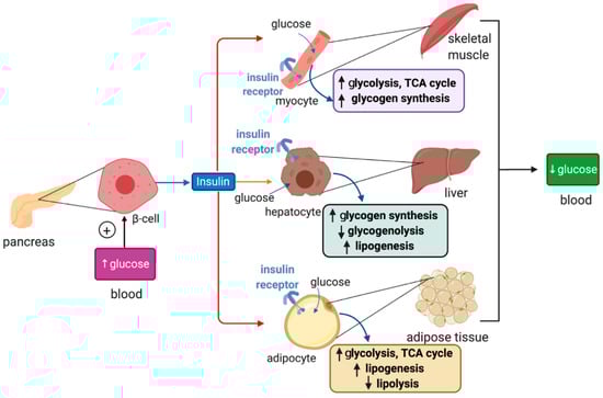Hormonal regulation of glucose metabolism by insulin. Insulin is synthesized in pancreatic β cells in response to hyperglycemia. It binds to insulin receptors in target cells (red arrows) such as skeletal muscle cells, hepatocytes and adipocytes and induces signaling pathways that promote glucose uptake, catabolism or storage. This reduces plasma glucose levels.