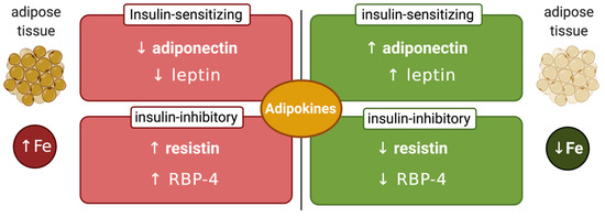 Iron-dependent regulation of adipokines. Increased adipose tissue iron levels inhibit insulin-sensitizing adiponectin and leptin and stimulate insulin-inhibitory resistin and retinol-binding protein 4 (RBP-4). Conversely, reduced adipose tissue iron levels stimulate insulin-sensitizing adiponectin and leptin and inhibit insulin-inhibitory resistin and RBP-4.