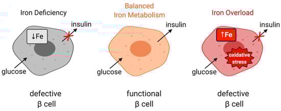 The role of iron in the physiological function of pancreatic β cells. Balanced iron metabolism is critical for proper glucose-stimulated insulin production. Iron deficiency as well as iron overload impair insulin expression.