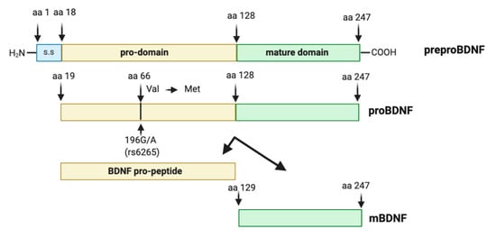 Brain-derived neurotrophic factor (BDNF) protein structure. The preproBDNF consists of three sequences: signal sequence (s.s), pro-domain, and mature domain. The intra- or extracellular cleavage of preproBDNF generates functionally active isoforms: BDNF pro-peptide and mature BDNF (mBDNF), each of which exhibits a characteristic affinity to a specific type of receptor. Arrowheads indicate known protease cleavage sites involved in the processing of mature BDNF. The position of the single nucleotide polymorphism (rs6265, Val66Met) and the substitution of valine (Val) in methionine (Met) at codon (aa) 66 in the human BDNF gene is indicated by an arrow.