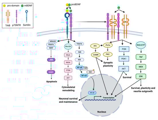 The mature domain of proBDNF interacts preferentially with p75NTR, mediating synaptic pruning in the prenatal brain [81]. ProBDNF, through its pro-domain, can also interact with the sortilin receptor or other vacuolar protein sorting 10 protein (Vps10p) (Figure 2). Thus, proBDNF binding to specific receptors triggers signaling pathways, which can determine neuronal fate via promoting their death or survival [82,83]. The proBDNF/p75NTR/sortilin binding complex initiates signaling cascades leading to the activation of c-Jun amino terminal kinase (JNK). This pathway is involved in neuronal apoptosis [82,83]. High levels of p75NTR expression are detected during brain development and post-traumatic recovery [84]. When mature domain of BDNF binds to p75NTR, the RIP2 (serine/threonine-protein kinase 2)/TRAF6 (tumor necrosis factor receptor associated factor 6)-mediated pathway is initiated, which leads to NF-kB activation [82,85]. The activation of NF-kB promotes neuronal survival and maintenance during brain development [85]. In addition, p75NTR interacts also with the Ras homologous (Rho) protein family. This pathway is reported to regulate neuronal growth cone development and motility [85].