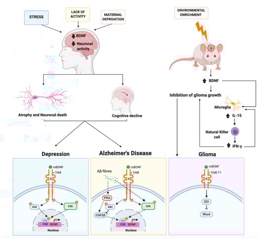 The molecular mechanisms mediated by BDNF involved in depression, Alzheimer’s disease, and glioma. External stimuli (stress, maternal deprivation, or lack of activity) causing epigenetic regulation processes can induce a reduction in BDNF expression level and in neuronal activity. This results in atrophy, neuronal death, and cognitive decline, which may contribute to depression or Alzheimer’s disease. In these pathologies the BDNF/TrkB signaling, which activates the downstream Akt and ERK signaling, is altered. Thus, such alterations cause an impairment of CREB signaling resulting in BDNF downregulation. The alteration of phosphorylation (P) inhibits (red X) the transcriptional machinery. In the mouse brain, environmental enrichment induces an increase of BDNF. BDNF, binding the truncated form of TrkB receptor (TrkB.T1), signals directly to the Rho protein dissociation inhibitor (GDI). The latter detaches from TrkB.T1 and binds to the small G protein RhoA, leading to an inhibition of glioma cell migration. BDNF stimulates also indirectly the production of IL-15 in microglia, which in turn stimulates the natural killer cells to produce IFN-γ. IFN-γ contributes to reducing glioma growth.