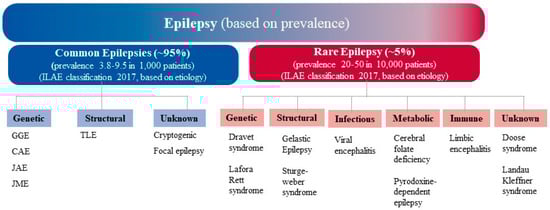 Classification of epilepsy based on its prevalence. Classification of epilepsy based on prevalence of the disease in the global population, into common and rare epilepsies. Common epilepsy is more prevalent in people with epilepsy (~95%) and around ~5% people with epilepsy suffer from rare epilepsy syndromes. According to the latest International League Against Epilepsy (ILAE) classification in 2017, epilepsy is classified based on etiology into genetic, structural, infectious, metabolic, immune and unknown. Different types of are represented under each of these sub-categories. GGE: Genetic generalized epilepsy, CAE: Childhood absence epilepsy, JAE: Juvenile absence epilepsy, JME: Juvenile myoclonic epilepsy, TLE: Temporal lobe epilepsy.