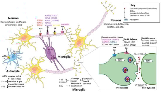 Epilepsy genes: Illustration of several possible patho-genetic mechanisms for common epilepsies. This figure represents the neural network of different cells involved in neurotransmission in brain tissues of epilepsy cases. A broad range of epilepsy mechanisms are implicated due to the identification of genes in the cell body, axon, pre-synapse, post-synapse and in neuroglia. Variation in these genes cause gain or loss of function, culminating in channelopathy disturbance, transporter defects, synaptic dysfunction, DNA repair and chromatin remodeling and transcriptional dysregulation. These defects lead to low threshold action potential and the genes involved in this are SCN2A, SCN8A, SCN3B, KCNJ3, KCNJ10, KCNN3, KCNMB3, CACNA1H, AQP4. Genes such as CACANA1A, CACNG3, CACNB4, CHRNA4, GRM4, LGI1, ASIC1a, STX1B, SYN2, SLC12A5 ME2, ALDH5A, Il-1β and IL-1RA and GABA-A and GABA-B receptor genes affect neurotransmitter synthesis or release either directly or indirectly, which causes an imbalance in excitatory and inhibitory neurotransmitters, causing hyper-excitability in neurons. Other than these, some genes like PCDH7, CPA6, EFHC1, C3, BRD2 and BDNF cause defects in synaptic inhibition during brain development, resulting in neuronal hyper-excitability and epilepsy development.