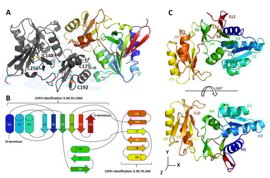Each monomer is composed of six alpha helices and twelve beta strands distributed into two domains. Domain 1 spans residues 29 to 160 and 246 to 264, folds according to the Rossmann topology, and is part of an unnamed structural superfamily (CATH classification 3.40.50.1360). Domain 2 is inserted in between the two parts of domain 1, spans residues 161 to 245, and is classified as an ACT domain (CATH classification 3.30.70.260) (Figure 1B).