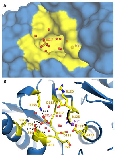 CrRPI1 catalytic pocket. (A) The Connolly solvent exclusion surface of the catalytic cleft of CrRPI1 with ligands in it (sulfate ion, water, sodium ion). Residues contributing to the cavity are colored in yellow, other residues are colored in blue. (B) The same view of the catalytic cleft as in (A). The protein is colored in blue and represented in cartoon. Residues contributing to the catalytic cleft are colored in yellow and their side chains are represented in sticks. Polar contacts between ligand and residues are represented in black dashed lines with corresponding interatomic distances indicated in Ångströms (Å).