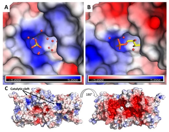 CrRPI1 crystallographic model includes a sulfate ion, a sodium ion and water molecules located in a shallow pocket exposed to solvent (Figure 4A). Structural superposition of CrRPI1 with RpiA from Legionella pneumophila (LpRPI, PDB: 6MC0, RMSD = 0.734 Å), which is co-crystalized with ribose-5-phosphate bound to the active site, reveals extended similarities (Figure S2). Surface charges were calculated on Pymol using the APBS electrostatics plugin [27,28]. For both enzymes, the active site is an analog cavity with an electronegative charge at the center, surrounded by electropositive charges at the rims (Figure 5A,B). Electrostatic surface potentials are similarly distributed on both active sites, suggesting an identical electrostatic complementarity toward the substrate. Indeed, an electropositive patch just outside the cavity is ideally positioned to accommodate the phosphate moiety of R5P in LpRPI (Figure 5B) and was found to anchor the co-crystallized sulfate ion in CrRPI1 (Figure 5A). The sulfate ion in CrRPI1 hence occupies the location of the phosphate of the ribose-5-phosphate (Figure 5A,B) supporting a conserved mode of substrate recognition. This sulfate ion is coordinated by polar contacts with the side chains of S60, T61, and K155 and the main chain amine of T61. Residues K37, G59, S60, T61, A62, I150, and K155 principally contribute to the rest of the pocket surface in CrRPI1 (Figure 4B). All these residues are highly conserved in all species from the three kingdoms of life (Figure S1). Water molecules in CrRPI1 are placed where R5P carbon skeleton binds LpRPI. The sodium ion co-crystallized with CrRPI1 lies where the aldehyde function of R5P binds LpRPI. Residues D115 and E137 have been proposed to play a critical role in the catalytic mechanism [3,29]. In our model of CrRPI1, their side chains are positioned at, respectively, 3.1 Å and 6.4 Å away from the sodium ion, allowing their interaction with the carbonyl function of the substrate. Side chains rearrangements and water displacements are expected for the formation of the Michaelis complex and the subsequent catalytic isomerization.