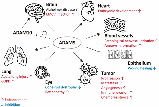 The role of ADAM9 in various pathophysiological conditions. Brain: ADAM9 acts as an α-secretase to reduce the risk of Alzheimer’s disease, but it can reduce the proportion of membrane-anchored ADAM10 and results in reduced α-secretase activity of ADAM10. Therefore, ADAM9 has inconclusive effects on brain. ADAM9 enhances the EMCV entry. Heart: ADAM9 is active in embryonic heart development. Blood vessels: ADAM9 enhances the pathological neovascularization and aneurysm formation. Epithelium: ADAM9 delays chronic wound healing. Tumor: ADAM9 promotes tumor progression, metastasis, angiogenesis, and immune evasion. Eye: ADAM9 increases retinopathy and loss of ADAM9 relates to CRD. Lung: ADAM9 is up-regulated in acute lung injury and promotes the development of COPD. Dashed T-bar arrow, inhibiting ADAM9 protease function reduced the shedding of ADAM10; T-bar arrow, inhibition of wound healing; Enhancement in red; Inhibition in blue.