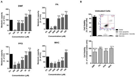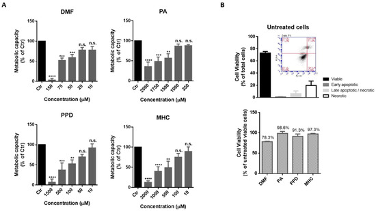 Cell metabolism was evaluated through Alamar Blue assay. DMF, PA, PPD and MHC concentrations that did not induce a significant reduction in cell metabolic capacity (compared to the control cells) were determined and further used to assess cell viability through flow cytometry. A non-toxic concentration of the chemicals (that did not reduce cell metabolism and did not induce more than 20% of cell death) was used in the subsequent experiments, as follows: