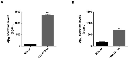 Aβ40 and Aβ42 peptide levels in N2a neuronal cells. Aβ40 (A) and Aβ42 (B) levels quantified in N2a serum-free supernatants, using a commercial kit. Values are the mean ± SEM of two independent experiments and expressed in pg/mL. Statistics: Unpaired t-test. p < 0.05 was considered significant: ** p < 0.01 and *** p < 0.001, compared to N2a-wt.
