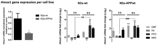 Effect of skin allergens on Hmox1 gene expression in neuronal cells. Normal (N2a-wt) and APP-overexpressing cells (N2a-APPwt) were exposed to the chemicals for 3 h or 6 h and mRNA levels of Hmox1 were analyzed by RT-PCR. Values are the mean ± SEM of three independent experiments and expressed relatively to control cells (log2 = 0). Statistics: One-way ANOVA with Tukey’s multiple comparisons test. p < 0.05 was considered significant: * p < 0.05, ** p < 0.01 and *** p < 0.001, compared to control cells; ## p < 0.01 and ### p < 0.001, compared to 6 h of chemical exposure. Basal mRNA levels of Hmox1 in untreated N2a neuronal cell lines are depicted in the left graph. The bars correspond to the normalized Hmox1 expression, expressed relatively to zero. Values are the mean ± SEM of seven independent experiments. Statistics: Unpaired t-test. t p < 0.05, compared to N2a-wt cells. Legend: DMF—Dimethyl fumarate, PA—Phthalic anhydride, PPD—1,4-Phenylenediamine, MHC—Methyl heptine carbonate.