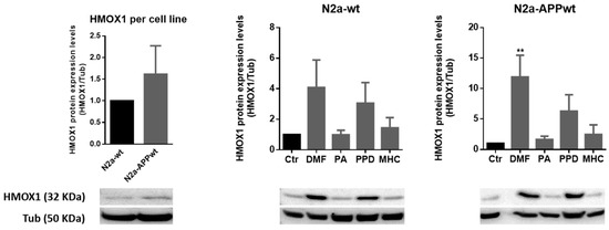 Since gene transcription does not always linearly correlate with its target protein expression [26], we wanted to confirm if the chemical-induced increase in the Hmox1 gene (Figure 5) resulted in higher protein levels. Thus, we analyzed HMOX1 protein expression by Western blotting in N2a-wt and APP-overexpressing cells after 24 h of chemical exposure (Figure 6).