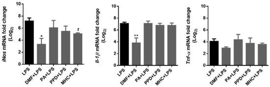 DMF strongly decreased the expression of iNos and Il-1β and induced a slight, non-significant decrease in Tnf-α (p = 0.07) mRNA evoked by LPS. Moreover, MHC also induced a significant reduction in iNos gene expression, evidencing its anti-inflammatory potential.