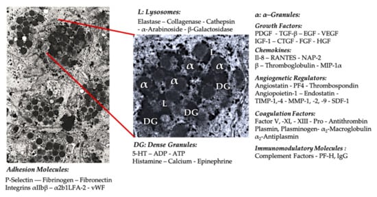 The most well-known physiological role of platelets is the control of hemorrhage, where they accumulate at tissue injury sites and damaged blood vessels. These events are instigated by the expression of integrins and selectins that stimulate platelet adhesion and aggregation. This process is further aggravated by damaged endothelium, with exposed collagen and other subendothelial matrix proteins prompting profound platelet activation. Under these circumstances, a significant role for the von Willebrand factor (vWF) interacting with glycoproteins (GPs), in particular with GP-Ib, has been demonstrated []. Following platelet activation, the platelet α-, dense, lysosomal, and T-granules undergo regulated exocytosis and release their contents into the extracellular environment (Figure 2) [,].