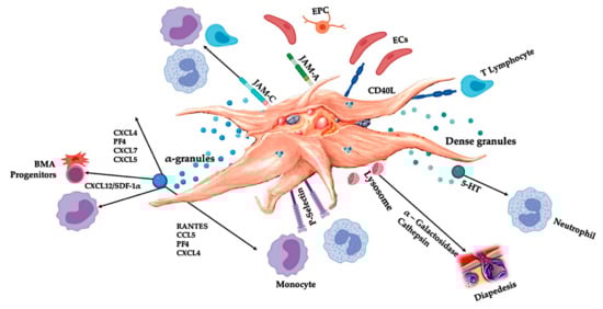 Activated platelets, releasing PGF, and adhesion molecules mediate a variety of cellular interactions: chemotaxis, cell adhesion, migration, cell differentiation, and stipulate to immunomodulatory activities [,]. These platelet cell-cell interactions contribute to angiogenesis [,,] and inflammatory [,] activities, ultimately to stimulate tissue repair processes. Abbreviations: BMA: bone marrow aspirate, EPC: endothelial progenitor cell, EC: endothelial cells, 5-HT: serotonin, RANTES: Regulated upon Activation Normal T Cell Expressed and Presumably Secreted, JAM: junctional adhesion molecules type, CD40L: cluster of differentiation 40 ligand, SDF-1α: stromal cell-derived factor 1 alpha, CXCL: chemokine (C-X-C motif) ligand, PF4: platelet factor 4. Adapted and modified from Everts et al. [].