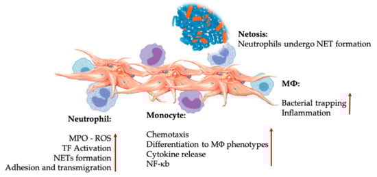 Platelet and leukocyte interactions in innate immunity cell interactions. Platelets interact with neutrophils, monocytes, and ultimately as well with MΦs, modulating and increasing their effector functions. These platelet-leukocyte interactions result in inflammatory contributions through different mechanisms, including NETosis []. Abbreviations: MPO: myeloperoxidase, ROS: reactive oxygen species, TF: tissue factor, NET: neutrophil extracellular traps, NF-κB: nuclear factor kappa B, MΦ: macrophage.