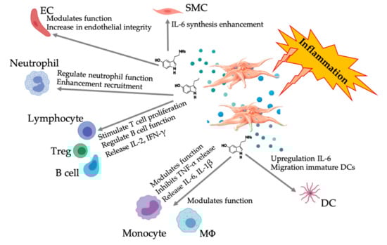 - Wan, M.; Ding, L.; Wang, D.; Han, J.; Gao, P. Serotonin: A Potent Immune Cell Modulator in Autoimmune Diseases. Front. Immunol. 2020, 11, 186. [Google Scholar] [CrossRef]