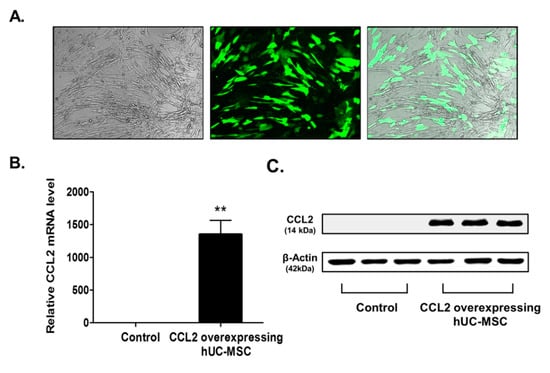 To confirm transfection of the CCL2-overexpression plasmid into MSCs, we verified GFP expression by fluorescence microscopy (Figure 1A) and upregulated CCL2 mRNA levels relative to controls (by ~1352-fold; p < 0.002) (Figure 1B). Additionally, western blot analysis indicated upregulated CCL2 levels in CCL2-overexpressing hUC-MSCs (Figure 1C, supplementary Figure S1). These findings confirmed the efficacy of Lipofectamine transfection for sustained MSC viability and gene delivery [13].