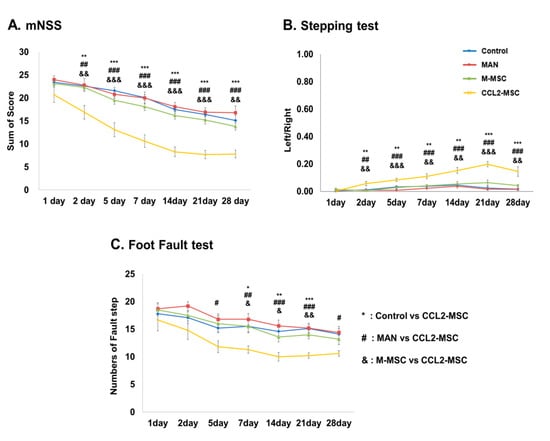 Evaluation of hUC-MSC transplantation according to behavioral testing. Changes in (A) mNSS, (B) stepping, and (C) foot-fault results for each group for up to 28 days after MCAo induction. Data represent the mean ± SEM and were analyzed by one-way ANOVA. * p < 0.05, ** p < 0.01, *** p < 0.001, control vs. CCL2-MSC; # p < 0.05, ## p < 0.01, ### p < 0.001, MAN vs. CCL2-MSC; & p < 0.05, && p < 0.01, &&& p < 0.001, M-MSC vs. CCL2-MSC.