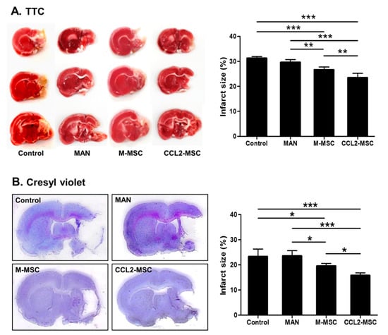 At 28 days after MCAo induction, we observed no significant change in the infarct size between the control and MAN groups but a significant decrease in infarct size in the M-MSC (control vs. M-MSC: 31.47% ± 0.62 vs. 26.67 ± 1.00; p < 0.001) and CCL2-MSC groups (control vs. CCL2-MSC: 31.47% ± 0.62 vs. 23.48 ± 1.55; p < 0.001) according to TTC staining (Figure 3A). Additionally, Cresyl Violet staining revealed similar results, with no significant difference in infarct size between control and MAN groups but significantly reduced sizes in the M-MSC (control vs. M-MSC: 23.3% ± 3.75 vs. 19.59 ± 1.36; p < 0.05) and CCL2-MSC groups (control vs. CCL2-MSC: 23.30% ± 3.75 vs. 15.80 ± 1.53; p < 0.001) (Figure 3B). Furthermore, both TTC (M-MSC vs. CCL2-MSC: 26.67% ± 1.00 vs. 23.48 ± 1.55; p = 0.004) and Cresyl Violet (M-MSC vs. CCL2-MSC: 19.59% ± 1.36 vs. 15.80 ± 1.53, p < 0.05) staining showed that the CCL2-MSC group exhibited more significant reductions in infarct size relative to the M-MSC group.