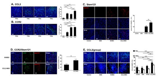 Rats were euthanized and transcardially perfused with heparinized saline and 4% PFA (Merck Millipore, Waltham, MA, USA). After perfusion, the brain was separated and fixed with 4% PFA overnight at 4 °C and then transferred to 30% sucrose solution (Sigma-Aldrich, St. Louis, MO, USA) for incubation for at least 3 days at 4 °C. The brains were then embedded using optimal cutting temperature compound and stored at −80 °C. Brain tissues were then sectioned at a thickness of 40 µM on a cryostat. Free-floating sections were blocked with 5% normal goat serum in PBS for 1 h at 20 °C and incubated with blocking buffer containing the following primary antibodies overnight at 4 °C: anti-Stem121 (1:200; Takara Bio, Shiga, Japan), anti-neuronal nuclei (NeuN; 1:200, Merck Millipore, Waltham, MA, USA), anti-bromodeoxyuridine (BrdU; 1:200; Invitrogen, Carlsbad, CA, USA), anti-doublecortin (DCX; 1:200, Cell Signaling Technology, Danvers, MA, USA), anti-vascular endothelial growth factor (VEGF; 1:200; Thermo Fisher Scientific, Waltham, MA, USA), anti-rat endothelial cell antigen-1 (RECA-1; 1:100; Abcam, Cambridge, UK), anti-ionized calcium-binding adapter molecule-1 (Iba-1; 1:500; Wako Pure Chemical Co., Kyoto, Japan), anti-glial fibrillary acidic protein (GFAP; 1:200; BD Pharmingen, San Diego, CA, USA), anti-ED1/CD68 (1:500; Bio-Rad, Hercules, CA, USA), anti-inducible nitric oxide synthase (iNOS; 1:50; Thermo Fisher Scientific, Waltham, MA, USA), anti-CD206 (1:100; Thermo Fisher Scientific, Waltham, MA, USA), anti-CCL2 (1:200; Abcam, Cambridge, UK), and anti-CCR2 (1:250; Abcam, Cambridge, UK). The sections were washed in PBS three times for 15 min each and then incubated with secondary antibodies (1;500, Invitrogen, Carlsbad, CA, USA) for 1 h at 20 °C. The sections were then treated with the nuclear marker 4′,6-diamidine-2′-phenylindole dihydrochloride (Sigma-Aldrich, St. Louis, MO, USA). The sections were cover-slipped with mounting solution (Vector Labs, Burlingame, CA, USA) to delay fading. Changes in CCL2 and CCR2 levels in the brain during acute ischemia were confirmed on the day before MCAo induction and days 1, 2 and 5 after MCAo induction. To investigate the migration and engraftment of IV-transplanted cells in the brain, Stem121 analysis was performed 1 day after the second transplantation. Co-localization of Stem121 and, CCL2 or CCR2 was also performed 1 day after the second transplantation. Changes in CCL2 level according treatment were determined at 5 days and 4 weeks after MCAo induction. Other immunohistochemical analyses to assess angiogenesis, neurogenesis, and neuro-inflammation were performed 4 weeks after MCAo induction. All immunohistochemical analyses were performed four or five times for each group.
