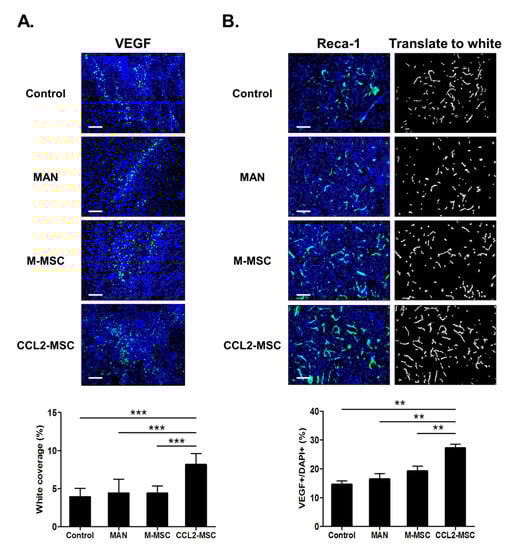 Human MSCs promote endogenous brain repair by enhancing angiogenesis in the peri-infarct area following stroke. To evaluate the degree of angiogenesis after transplantation of CCL2-overexpressing hUC-MSCs following brain ischemia, we immunostained for VEGF and RECA-1 to evaluate angiogenesis and microvessel density in the peri-infarct area, respectively. The results indicated a significantly higher number of VEGF+ cells in the M-MSC and CCL2-MSC groups relative to the control group, with the highest number of VEGF+ cells observed in the CCL2-MSC group (control: 15.16 ± 1.13%, MAN: 16.45 ± 1.74%, M-MSC: 19.21 ± 1.55%, and CCL2-MSC: 27.19 ± 1.19%; CCL2-MSC vs. other groups: p < 0.001) (Figure 5A). Moreover, RECA-1 immunostaining revealed a significantly higher vessel-coverage area in the CCL2-MSC group relative to then other groups (control: 3.92 ± 1.00%, MAN: 4.42 ± 1.63%, M-MSC: 4.41 ± 0.85%, and CCL2-MSC: 8.15 ± 1.31%; CCL2-MSC vs. control, MAN, and M-MSC: p = 0.001, p = 0.003, and p = 0.003, respectively) (Figure 5B). These findings suggested that CCL2-overexpressing hUC-MSCs enhanced peri-infarct angiogenesis following stroke.