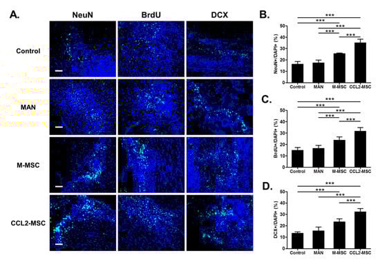 To evaluate endogenous neurogenesis in the peri-infarct area, we performed immunostaining for NeuN, BrdU, and DCX. The results showed that the M-MSC and CCL2-MSC groups exhibited significantly higher numbers of NeuN+ cells (control, 16.25 ± 2.20%; MAN, 17.32 ± 2.32% vs. M-MSC, 25.46 ± 0.62% vs. CCL2-MSC, 34.99 ± 2.90%; p < 0.001) (Figure 6B), BrdU+ cells (control, 14.77 ± 1.80%; MAN, 16.47 ± 1.21% vs. M-MSC, 23.69 ± 2.04%, vs. CCL2-MSC, 31.17 ± 2.92; p < 0.001) (Figure 6C) relative to the MAN and control groups. Additionally, the number of DCX+ cells was higher in the M-MSC and CCL2-MSC groups relative to the control group (control, 13.3 ± 1.20% vs. M-MSC, 23.34 ± 2.45 vs. CCL2-MSC, 32.45 ± 2.73; p < 0.001) (Figure 6D). All immunostaining results indicated that the CCL2-MSC groups showed a significantly higher number of positive cells relative to the M-MSC group (p < 0.001). These findings suggested that CCL2-overexpressing hUC-MSCs enhanced endogenous neurogenesis in the peri-infarct area following stroke.
