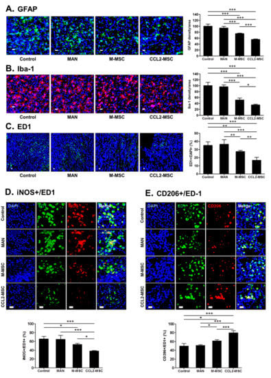 A previous study reported that in the micro-adherent cell/macrophage phenotype around the infarct area, the M1 macrophage phenotype induces post-ischemic inflammation, whereas the M2 phenotype exhibits neuroprotective effects [14], suggesting that inducing M2 and reducing M1 polarization following ischemic brain injury might promote brain recovery. To confirm changes in the these phenotypes, we stained for iNOS (an M1 marker) and CD206 (an M2 marker) among ED1(CD68)+ cells. First, the results confirmed no changes in the proportion of ED1+ cells around the infarct area in the control and MAN groups (Figure 7C), whereas the M-MSC and CCL2-MSC groups showed a significant decrease in the percentage of ED1+ cells relative to the control and MAN groups (control, 36.10 ± 4.10%; MAN, 36.77 ± 4.40%; M-MSC, 26.90 ± 1.63%; CCL2-MSC, 16.38 ± 3.02%; control vs. M-MSC: p = 0.008; control vs. CCL2-MSC: p < 0.001; MAN vs. M-MSC: p = 0.005; and MAN vs. CCL2-MSC: p < 0.001). Specifically, the CCL2-MSC group showed a significant reduction in ED1+ cells as compared with the M-MSC group (M-MSC vs. CCL2-MSC: 26.90 ± 1.63% vs. 16.38 ± 3.02%; p = 0.003). Additionally, the proportion of iNOS+ cells among ED1+ cells around the infarct area in the MAN group did not changed relative to that in the control group (control: 65.35 ± 5.09%; and MAN: 64.25 ± 8.18%) (Figure 7D); however, in the MSC groups, the iNOS+:ED1+ ratio slightly decreased relative to the control group, with the CCL2-MSC group showing a more significant reduction in this ratio than the M-MSC group (M-MSC, 52.90 ± 2.4%; CCL2-MSC, 37.93 ± 1.14%; control vs. M-MSC: p < 0.05; control vs. CCL2-MSC: p < 0.001; and M-MSC vs. CCL2-MSC: p < 0.02) (Figure 7D). Furthermore, the proportion of CD206+ cells among ED1+ cells around the infarct area in the MAN group was similar to that in the control group (control: 50.40 ± 5.21%; and MAN: 50.99 ± 1.43%) (Figure 7E), whereas in the MSC groups, the CD206+:ED1+ ratio increased significantly relative to that in the control group, with the CCL2-MSC group showing a more significant increase than that in the M-MSC group (M-MSC vs. CCL2-MSC: 61.07 ± 2.63 vs. 79.58 ± 4.38; p < 0.001) (Figure 7E). These results demonstrated that CCL2-overexpressing hUC-MSCs promoted the repair of damaged brain tissue by regulating the inflammatory environment in the infarct area.