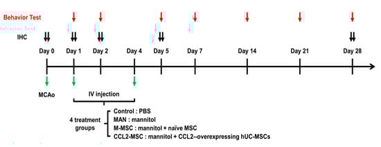 The in vivo experiments are described in Figure 8. Mannitol, which is effective at increasing the permeability of the blood–brain barrier (BBB) [50], was injected prior to implantation. According to cell administration described in a previous study [47], intravenous (IV) mannitol (2.5 mL of 20% solution; injection speed: 1.0 mL/min) and either IV hUC-MSCs or IV CCL2-overexpressing hUC-MSCs (1 × 106 cells in 0.5 mL PBS) were carefully injected into the tail vein at two different transplantation time points (1- and 4-days post-MCAo induction) in the cell-transplantation group. Immunosuppressive drugs were not used. The PBS group received only IV PBS, and the MAN group received only IV mannitol without cell transplantation at the same time points. During the procedure, no profound bleeding occurred during transplantation, and vital signs in rats were stable. There were no perioperative complications (death or severe morbidity) in any of the four tested groups or significant changes in temperature and weight (data not shown). All rats, including those receiving CCL2-overexpressing hUC-MSC transplantation, survived during the experiment, supporting the safety of these hUC-MSCs.