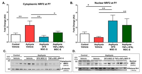 AS rats showed increased cytoplasmic NRF2 protein levels (>2-fold; p < 0.05, N = 7), compared to those by CS (N = 7; Figure 2A,C). A single intranasal administration of DFX-MSC-S (p < 0.005, N = 6) or TNF-α+IFN-γ-MSC-S (p < 0.05, N = 7) reversed the effect of PA on cytoplasmic NRF2 protein levels (Figure 2A,C).