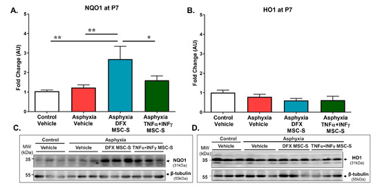 Effect of intranasal administration of DFX- or TNF-α+IFN-γ-MSC-S on NRF2 effector NQO1 and HO1 protein levels determined in hippocampus of PA-exposed and control rats at P7. (A) NQO1 and (B). HO1 hippocampal protein levels evaluated by Western blot in control (CS, white bar) and asphyxia-exposed rats (AS, red bar), intranasally treated with vehicle- or DFX -MSC-S(cyan bar) or TNF-α+IFN-γ-MSC-S (green bar) at P7. β-tubulin was used as normalizer for protein extracts. Data are presented as ratios of protein levels/normalizer levels, relative to vehicle control levels. Representative Western blot images are shown in (C) and (D). Data represent means ± SEM. (A) NQO1levels: A single intranasal administration of DFX-MSC-S to PA-exposed rats (cyan bar) increased NQO1 levels compared to AS (red bar) and CS rats (white bar). One-way ANOVA, F(3,19) = 4.966,* p < 0.01 Benjamini, Hochberg, and Yekutieli post-hoc: ** p < 0.005, CS v/s Asphyxia-DFX-MSC-S, ** p < 0.005; AS v/s Asphyxia-DFX-MSC-S, * p = 0.05; Asphyxia-DFX-MSC-S v/s Asphyxia-TNFα+IFN-γ-MSC-S, N = 5–6 samples per group. (B) HO1 levels: No effect of PA and/or MSC-S treatment was observed on HO1 protein levels, evaluated in hippocampus at P7. One-way ANOVA, F(3,29 = 1.726, n.s. N = 8 samples per group.