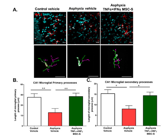 Effect of intranasal administration of TNF-α+IFN-γ-MSC-S on microglial process length in hippocampal CA1 region from PA-exposed rats at P7. (A) Representative microphotographs of immunofluorescence of IBA-1 (red) counterstained with DAPI (cyan) markers from controls and asphyxia rats treated with vehicle (AS) and asphyxia rats treated with-TNF-α+IFN-γ-MSC-S in the stratum radiatum of the CA1 hippocampal region at P7. White arrows indicate representative microglial cells depicted in the lower panel showing the three-dimensional reconstruction of their primary (green) and secondary (purple) processes, analyzed by FIJI software. (Bar: 20µm). Length of primary microglial processes. (B) Length of secondary microglial processes (IBA-1+ cells). (C) Data represent mean ± SEM. * p ˂ 0.05 ANOVA and Benjamini, Hochberg, and Yekutieli post-test. (B) Primary processes; ** p < 0.005, Control vehicle (CS) v/s AS; * p < 0.05, AS v/s Asphyxia- TNF-α+IFN-γ-MSC-S. (C). Secondary processes; ** p < 0.005, CS v/s AS; * p < 0.05, AS v/s Asphyxia-TNF-α+IFN-γ-MSC-S, N = 5–8 samples per group.