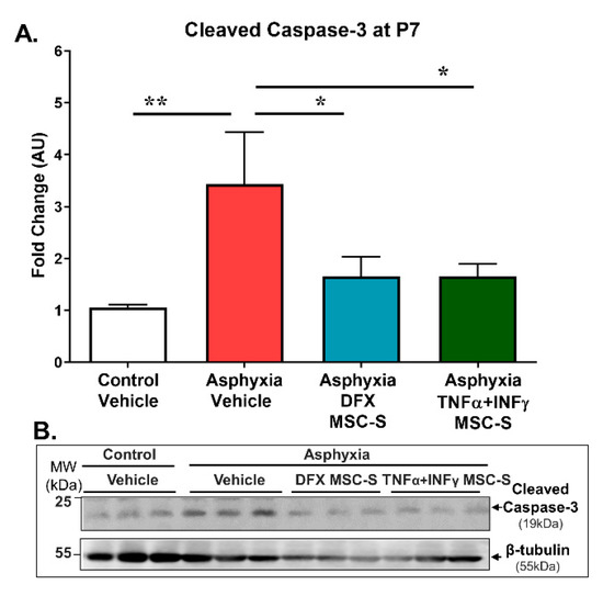 Increased TUNEL-positive cell death and cleaved-caspase-3 have been described in hippocampus at P1, P3, and P7 in PA rats [5,7,25], even at P30 [6]. In this report, we found that treatment with either DFX-MSC-S or TNFα−IFNγ-MSC-S decreased PA-induced hippocampus cell death evaluated at P7, monitored by cleaved-caspase-3, suggesting decreased apoptosis.