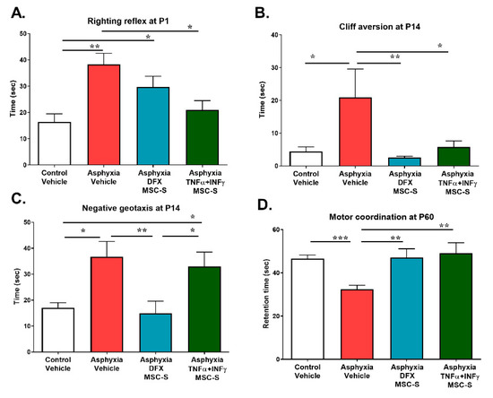 The righting reflex was evaluated by monitoring the time required to recover from a forced supine to a natural prone position, as indicative of brain stem and spinal cord reflexes [61]. Righting evaluation at P1 showed that AS rats remained for a longer time (sec) in the supine position (~1.5-fold; p < 0.005, N = 36) than CS rats (N = 36; Figure 7A). TNF-α+IFN-γ- MSC-S administration improved the righting reflex (p < 0.05; N = 38) to values similar to those shown by CS animals (Figure 7A). No effect on the righting reflex was observed in DFX-MSC-S-treated PA-exposed rats.