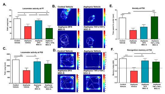 Recognition memory was evaluated by the novel object recognition test at P30 with a 24 h delay between the first exposure and the recalling session. The time spent exploring a novel object was considered as a memory index (time spent exploring the new object divided by the total time spent exploring the old and new objects). Values of memory index lower than 0.5 indicate a recognition memory deficit [62]. AS rats showed a decreased memory index (by 50%, p < 0.005), compared to that shown by CS rats (Figure 8F). DFX-MSC-S (p < 0.05) or TNF-α+IFN-γ-MSC-S (p < 0.05) treatment prevented the decrease in memory index observed in AS rats, which improved up to the level observed in the CS group at P30 (Figure 8F).
