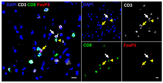 Immunofluorescence staining of CD3, CD8, and FoxP3: detection of T-cell subsets by multicolor immunofluorescence staining is visualized by an overlay (left) and single fluorescence images (right). The white arrow points towards T helper cells (CD3+CD8−FOXP3−), the yellow arrowhead points towards cytotoxic T cells (CD3+CD8+FOXP3−), and the yellow arrow points towards a regulatory T cell (CD3+CD8−FOXP3+). Scale bar = 10 µm.