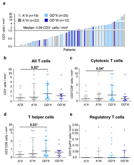T cell infiltration in primary IDHmut glioma: (a) distribution of T cell infiltration normalized to the area analyzed and color-coded for glioma subtype and WHO grade and (b–e) analysis of T cell infiltration in astrocytoma and oligodendroglioma categorized by their WHO grade for (b) all T cells, (c) cytotoxic T cells, (d) T helper cells, and (e) regulatory T cells. A, astrocytoma; OD, oligodendroglioma; mm2, square millimeter; II, WHO grade II; III, WHO grade III; * p < 0.05.