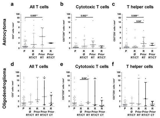 T-cell infiltration in primary and recurrent IDHmut gliomas according to pretreatment: primary and recurrent (a–c) astrocytoma and (d–f) oligodendroglioma were classified according to the previous treatment of their predecessor tumor. Infiltration rates of (a,d) all T cells, (b,e) cytotoxic T cells, and (c,f) T helper cells were analyzed. P, primary; R, recurrent; Ø, no prior; RT, radiotherapy; CT, chemotherapy; RT/CT, radiochemotherapy; and mm2, square millimeter; * p < 0.05; and ** p < 0.01.