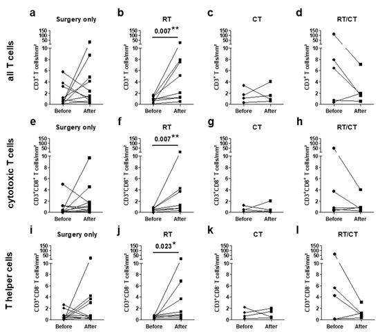 T-cell infiltration in pairs of IDHmut glioma before and after adjuvant treatment: infiltration of (a–d) all T cells, (e–h) cytotoxic T cells, and (i–l) T helper cells were analyzed in pairs of glioma before and after the adjuvant treatment of the first tumor. Pairs were classified according to the pretreatment of the first tumor into (a,e,i) no adjuvant treatment (n = 10), (b,f,j) radiotherapy (n = 8), (c,g,k) chemotherapy (n = 4), and (d,h,l) radiochemotherapy (n = 6). RT, radiotherapy; CT, chemotherapy; RT/CT, radiochemotherapy; mm2, square millimeter; * p < 0.05; and ** p < 0.01.