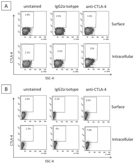 Flow-cytometric analysis of CTLA-4 in human breast cancer cells MDA-MB-231 (A) and MCF-7 (B). MDA-MB-231 and MCF-7 were stained on their surface or intracellularly with the designated antibodies. IgG2a Isotype corresponds to the staining with a negative class-matched control antibody. Results are expressed as percentage of stained cells.